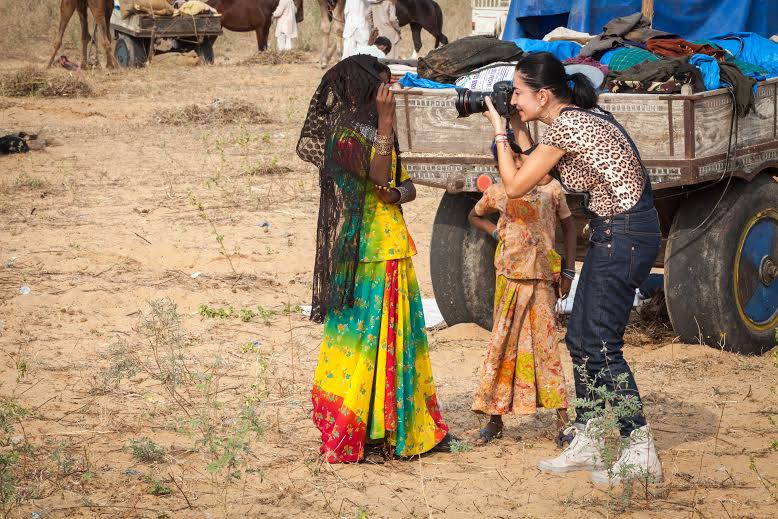 One afternoon, as we walk toward an uphill stretch dotted with herds of camels and horses, we are stopped by a beautiful young girl. Ringed with kohl, her eyes are a light creamy amber and her dusky skin glimmers in the pale winter sun. In a sweet voice she says, “Oh babu, mera ek photo le lo.” (Oh babu, please take a photograph) and quickly follow it with a “Photo le liya, ab paise do.” (You clicked my photograph. Now, you have to pay me) A little while later, she is seen smoking a cigarette with great panache and style as a group of photographers surround her. She feels fabulous and she cherishes all the attention she receives. Ironic as it may seem, her job is to wake up, look gorgeous, and get to work every day.