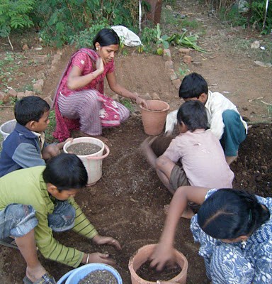 Another significant aspect of the programming is the inclusion and value of agricultural work and engagement with the land. Adharshila’s founders learned from elders involved in the Adivasi Mukti Sangathan that children who attended government schooling began to view their communities, and the labor their families engaged in (farming, herding, etc.) as backwards. To challenge this hierarchy of knowledge that positions manual labor as lower than intellectual work, Adharshila’s leaders and community teachers created an organic farm on their school’s land that students are responsible for. Students till the land, grow food, and help cook meals. The integration of organic farming into their school life has strengthened the bond between students and the natural world, and counters the alienation that students and families feel once their children enter the institution of school.
