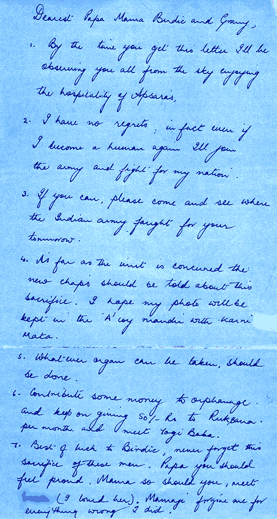 - As far as the unit is concerned the new chaps should be told about this sacrifice. I hope my photo will be kept in the A Coy mandir with Karni Mata.
