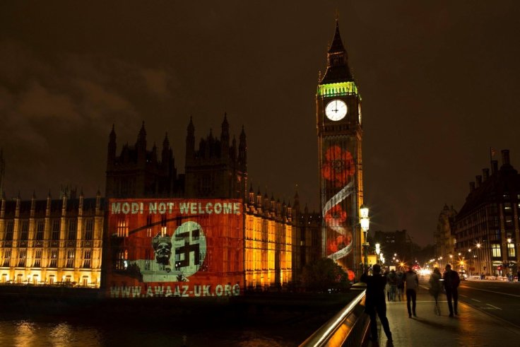 On 8 November, as a mark of protest against Modi’s visit, the Awaaz Network had projected the words, ‘Modi not Welcome’ on the side of the British Parliament. It shows an image of Modi wielding a sword in front of the OM sign, which slowly turned into a swastika, the Nazi symbol.