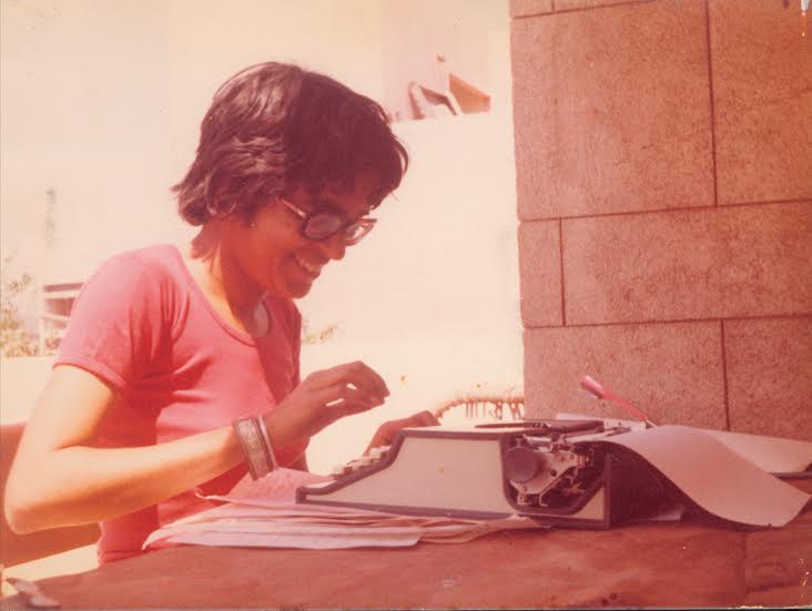 Picture in the text: Ruth typing on a manual typewriter on the terrace of Manushi office in Lajpat Nagar in the 1980s. The picture was taken by Patty Rupert, an American volunteer at Manushi at the time.