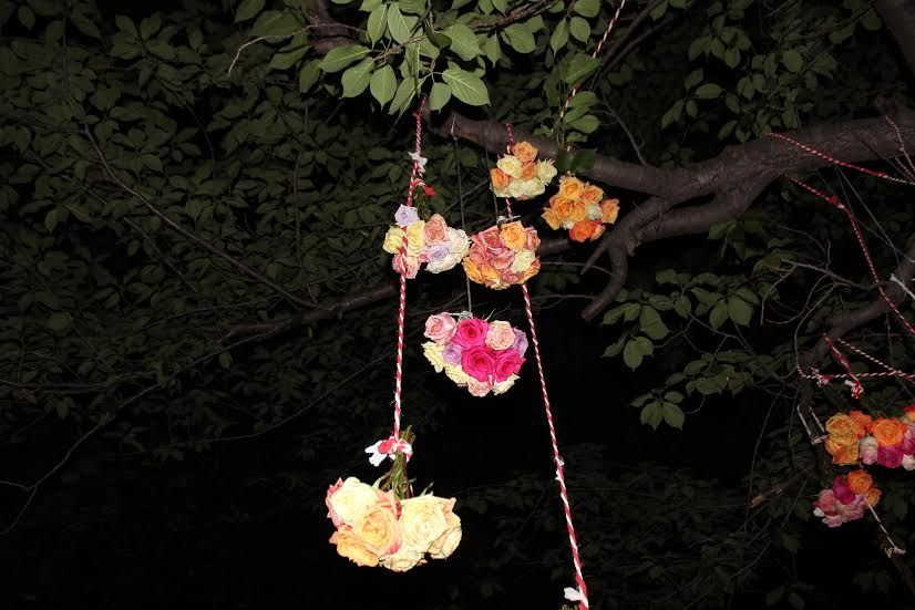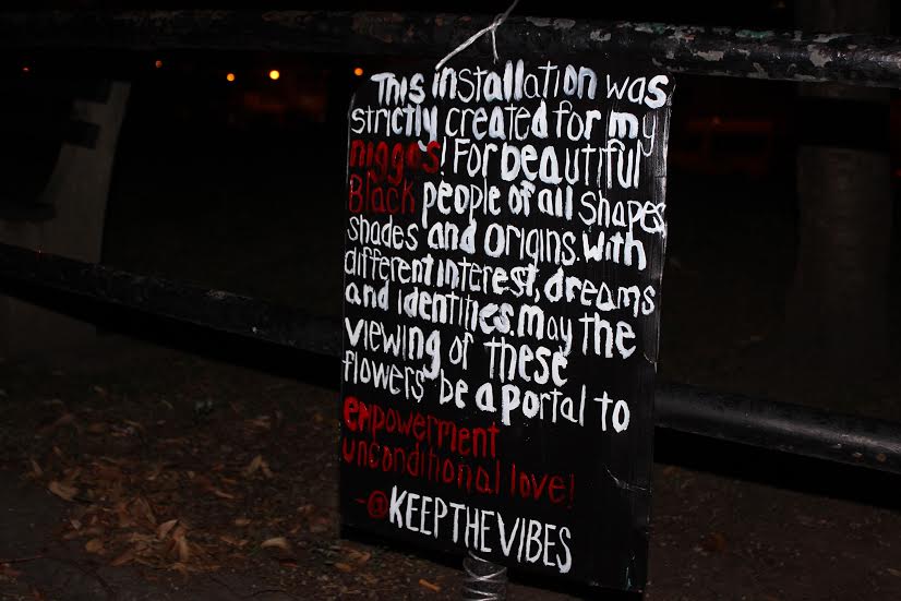 There was an installation in front of me: bunches of flowers hanging from a tree. It was clear that it had been created as a direct response to the mindless and unabated murders of African Americans in the US. Sensing, rather fearing, that the installation might be taken down soon I went home and returned to the park with my camera that same night to take pictures and, thus, archive this powerful piece of political art. Later while scanning the artist’s twitter page @KeepTheVibes, I found that “Strange Fruit” was indeed the title she had given this installation. The next day when I passed through the park the installation was gone. From twitter, I learnt that the cops had pulled down the installation. Here I bring you the pictures of that installation.